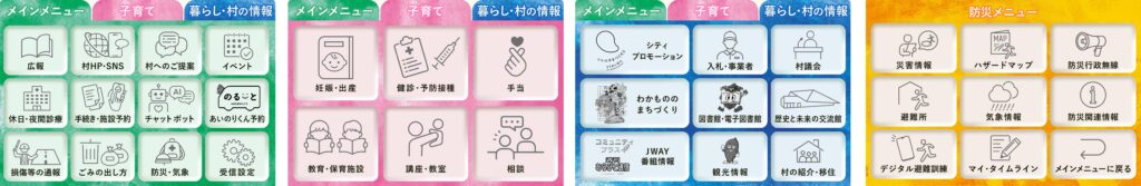 LINEのトーク画面下部に固定表示されているリッチメニューを切り替えることができる「タブ機能」を利用して、ジャンル別にメニューを表示させることができるようになりました。「メインメニュー」「子育て」「暮らし・村の情報」に加え防災・気象の計4つのメニューを表示することができます。