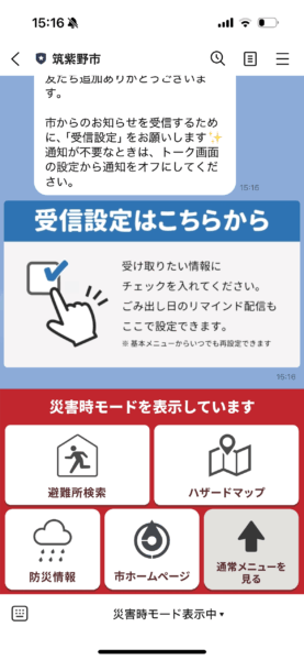 筑紫野市のLINE公式アカウントでは気象・地震情報のほか、市で運用しているハザードマップや防災対策のホームページに直接リンクさせて、防災情報を日頃から提供。避難所検索の機能も利用し、チャットボットの案内に従って位置情報を送ることで周辺の避難所をリスト表示します。