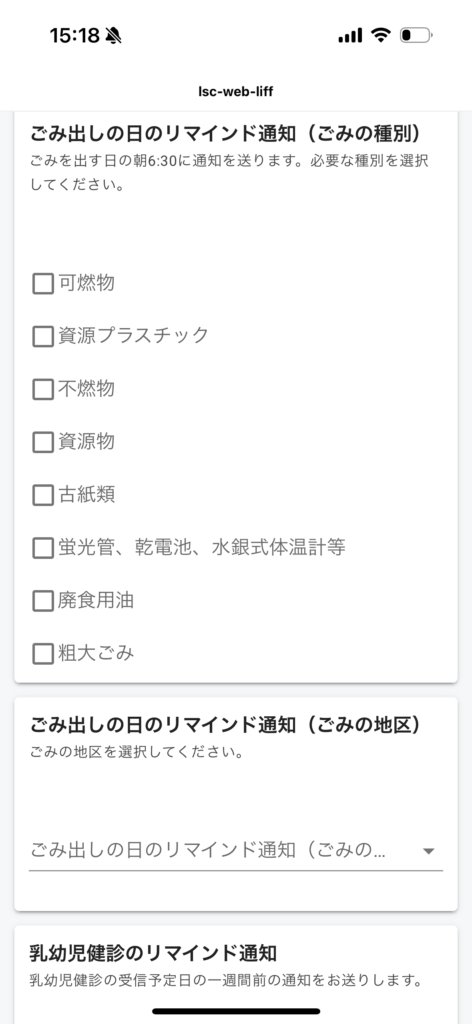 満足度調査で高評価だった江別市のLINE公式アカウントでは、ごみとリサイクルの情報をチャットボットで展開。ごみ出しの情報はセグメント配信のため、受信設定のフォームからごみの種別と地区を登録することで、LINEに定期的にごみのお知らせが届きます。
