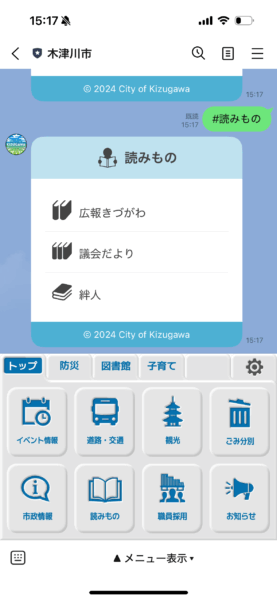 木津川市のLINE公式アカウントでは、トップの「読みもの」というアイコンを押すと表示される「広報きづがわ」から広報紙のバックナンバーにアクセス可能。いつでも最新の広報紙をLINE内で見ることができます。