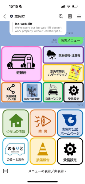 また、災害発生時の専用メニューを管理画面に登録しておくと、災害が起こった際に適用ボタンを押すことで専用メニューへ切り替わります。これによって通常メニューでは防災のアイコンをタップしないと受け取れない防災情報もメニューからすぐに確認できるようになります。