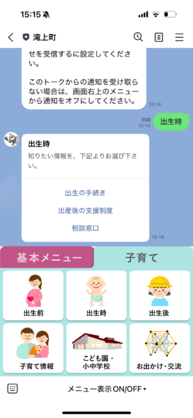 北海道滝上町では、出生届関連の情報を探す際、従来はホームページの中を探す必要がありましたが、LINE上でQ&A形式で誘導することで必要な持ち物や手続きを簡単に確認できるようになりました。滝上町の子育てのチャットボットは、ホームページで情報を調べるよりも少ないタップアクションで目的の情報までたどり着くことができ、ユーザーにとって非常に分かりやすい動線設計となっています。