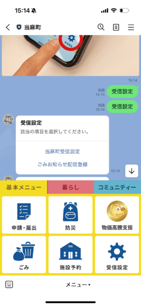当麻町のLINE公式アカウントでは、基本メニューにある受信設定をタップすると、セグメント配信を開始するための受信設定ができるようになっています。「当麻町受信設定」と「ごみお知らせ配信登録」に分かれており、それぞれ希望のカテゴリーや居住地域を選択して回答を送信するだけで登録が完了します。