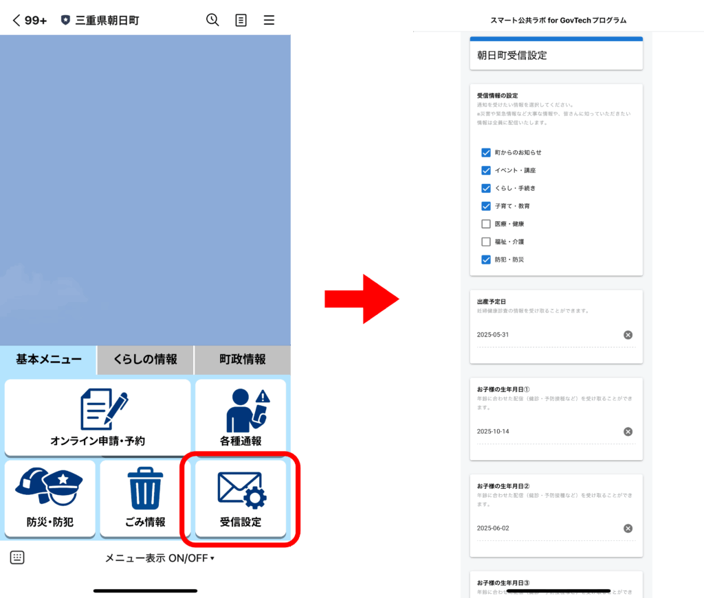 住民の希望に応じた配信だけを届ける「セグメント配信」機能を導入、欲しい配信カテゴリーを「受信設定」に回答することでカスタマイズすることができます。住民がほしい情報に絞って配信ができるため、町からの情報発信がこれまで以上に効果的になることが期待されます。