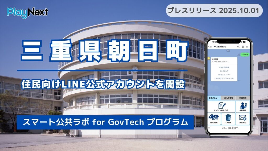 プレイネクストラボ株式会社(本社:東京都品川区、代表取締役:柏 匠、以下 「プレイネクストラボ」)の提供する「スマート公共ラボ for GovTechプログラム」が、三重県朝日町(以下「朝日町」)のLINE公式アカウントに採用され、2025年10月1日(水曜日)より一般公開したことをお知らせします。