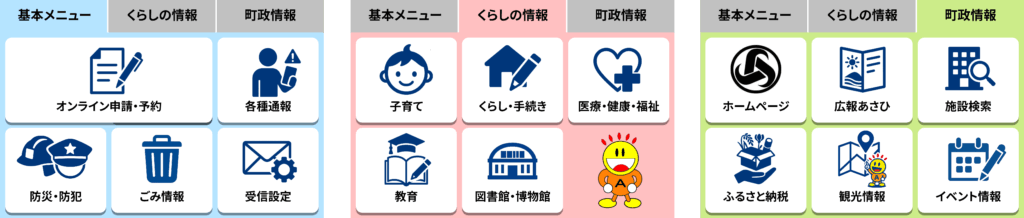 「基本メニュー」「くらしの情報」「町政情報」のメニューから様々な情報を検索することが可能になりました。