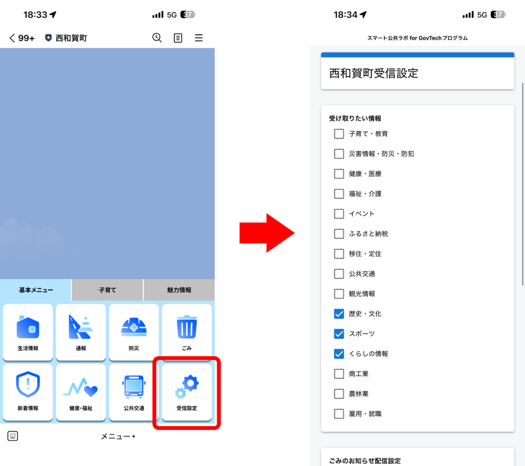 住民の希望に応じた配信だけを届ける「セグメント配信」機能を導入。欲しい配信カテゴリーを「受信設定」に回答することでカスタマイズすることができます。住民がほしい情報に絞って配信ができるため、町からの情報発信がこれまで以上に効果的になることが期待されます。