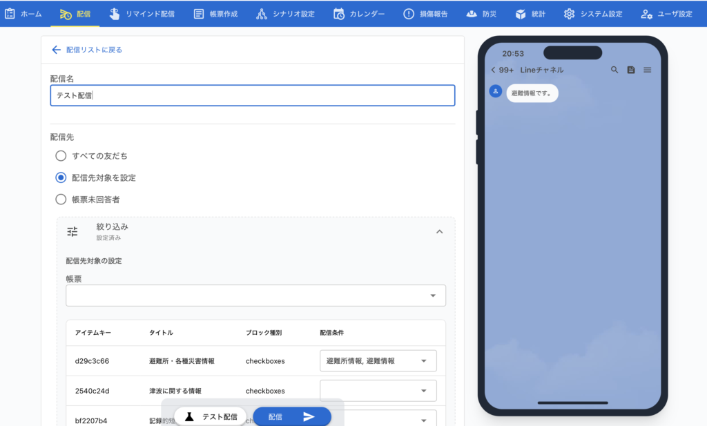 また、Lアラート(災害情報共有システム)と連携することで、避難情報や警報などの防災情報をLINEへ自動配信することが可能となりました。