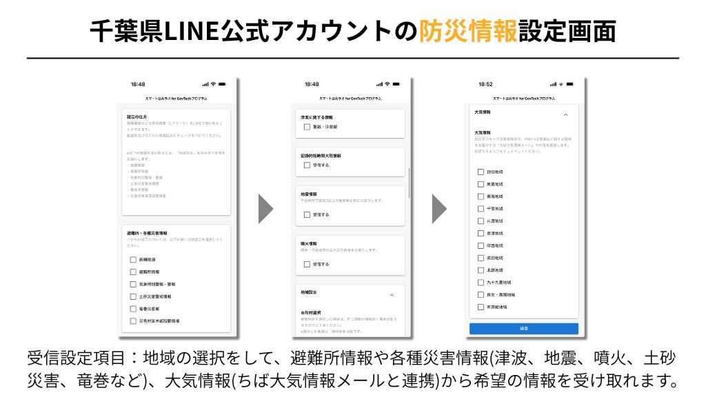 Lアラートや「ちば安全・安心メール」「ちば大気保全メール」と連携することで、既存の情報配信基盤を活かしながら、住民にとって身近なLINEで情報を受信できる仕組みが構築されています。