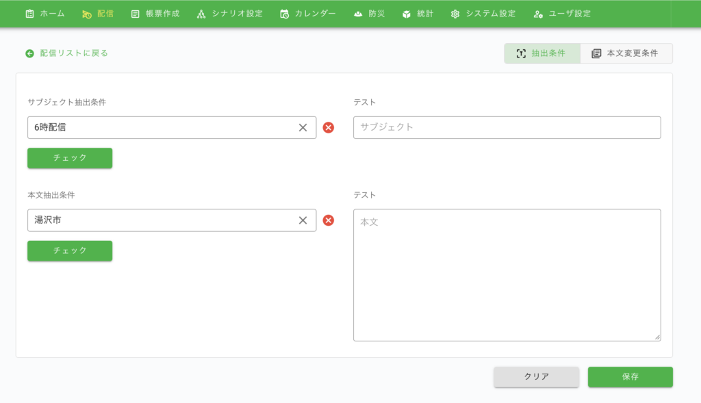 次に、メールの振り分け設定。メールのタイトルや本文に含まれる「エリア情報」「日時」「クマ」「出没」「注意」などのキーワードを条件にLINE配信対象を自動振り分けることが可能です。