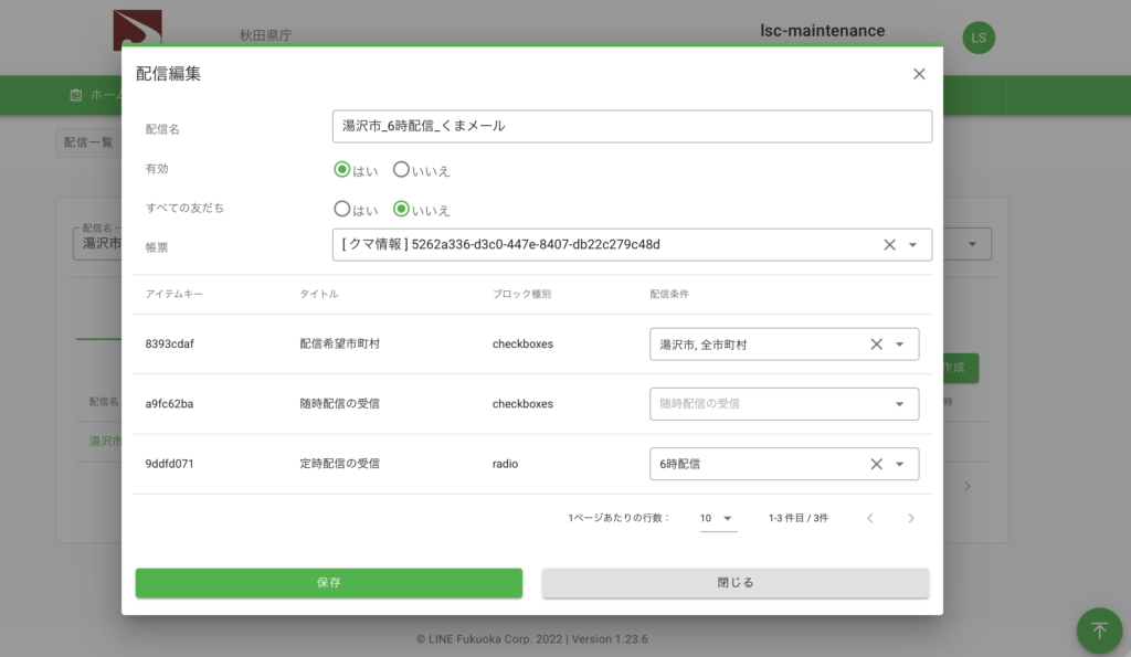 秋田県庁:ツキノワグマ等情報マップシステム「クマダス」(以下「クマダス」)と県公式LINEを外部配信連携させたことで、クマダスへの出没情報のデータ登録から配信までが自動化されました。通常のSNS配信のように手動で投稿文を作成し、配信ボタンを押す手間が省けたことは、緊急時の対応が多い職員にとって大きなメリットです。また、地域指定(市町村単位)を可能にしたことで、ユーザーが欲しい情報を絞り込めるようにしています。この仕組みが、ブロックを防ぎ、継続的な利用につながっていると感じています。