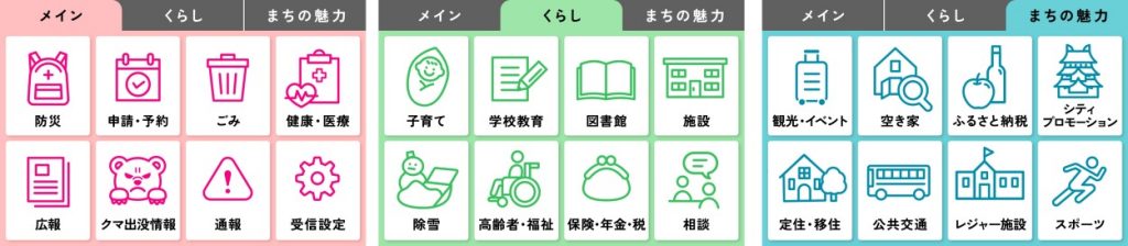 画面下部に固定されている「メイン」「くらし」「まちの魅力」のメニューを「タブ機能」で設置。各種メニューより、様々な市政情報を手元のスマートフォンから検索することが可能です。