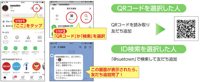 ご利用にあたってはLINEアプリをインストールしてください。LINEのご利用には、スマートフォン、タブレット端末などのLINEアプリを起動できる環境が必要です。LINEアプリを起動後、QRコードまたはID検索で「suetown」を検索し、須恵町のLINE公式アカウントを友だち追加します。