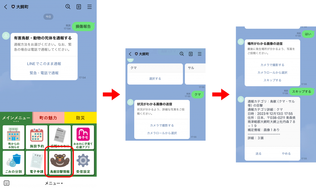 住民から鳥獣などの目撃情報を連絡できる「通報機能」を導入。ユーザーはチャットボットの案内に従い、現場の写真や位置、詳細情報を送ることで通報することが可能です。